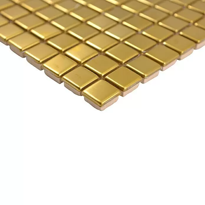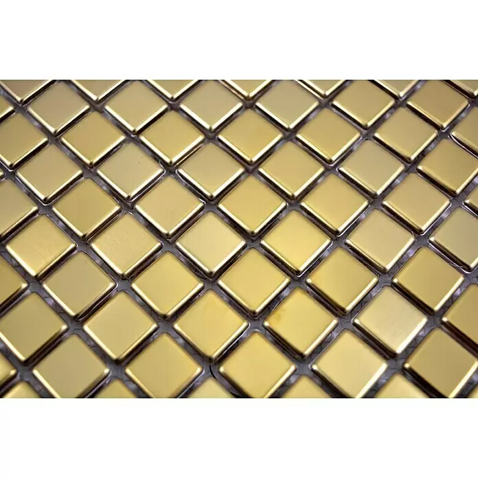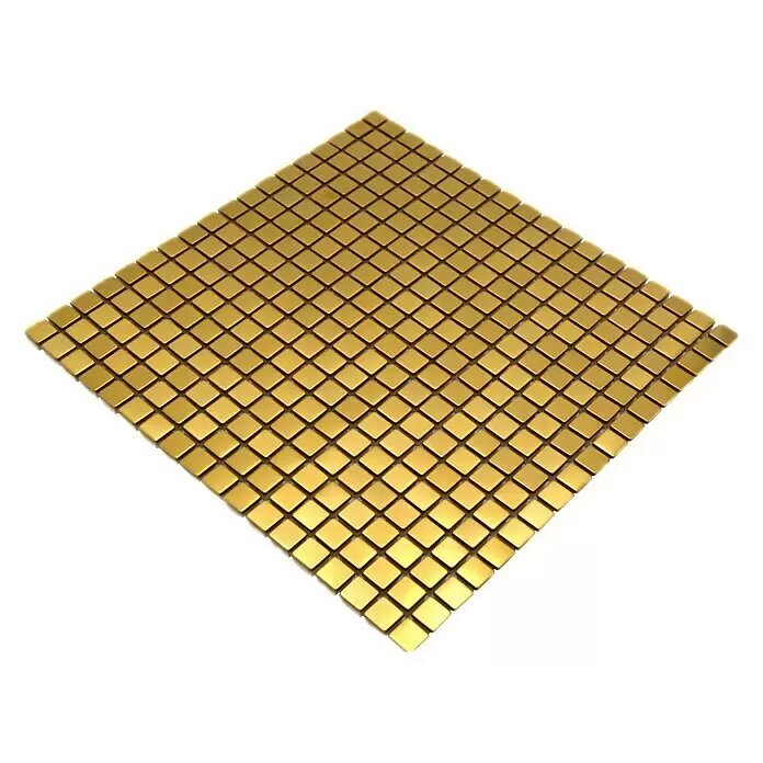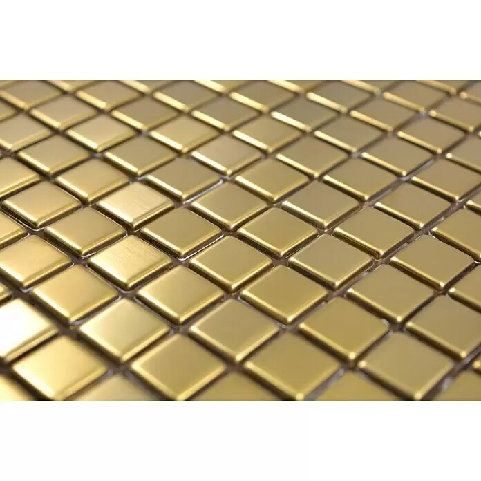 Shop Dune Metallic Gold mosaic tiles – brushed & polished stainless steel with satin finish. Perfect for luxury bathrooms, kitchens & statement walls.