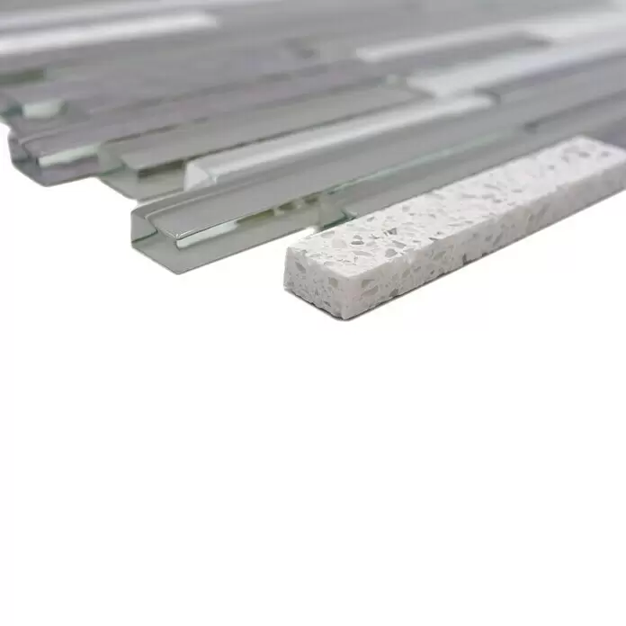 The mosaic tile combines a natural stone with matching glass decoration and creates a cozy ambience with the necessary eye-catcher. While the stone creates a cozy environment, the glass mosaic makes the wall sparkle with a beautiful refraction of light. Both materials benefit from each other and give this warmth back to the room in the form of sensuality and harmony.